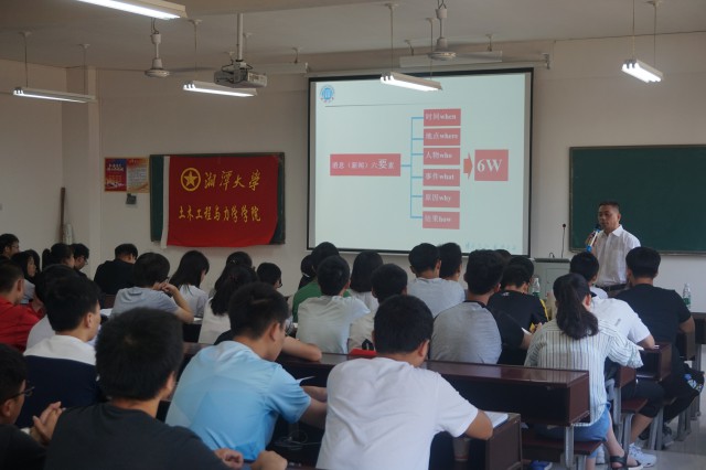 谢书记简单介绍了新闻文体的分类及基本概念,强调了新闻写作过程中新闻要素的重要性,着重介绍了消息写作的技巧如“倒金字塔结构,把最重要的受众最感兴趣的新闻事实开门见山进行交代,按重要程度铺排全文。消息写作还包括可以适当的使用生动的动词,但要做到真实、不浮夸。要多使用短句,等等。