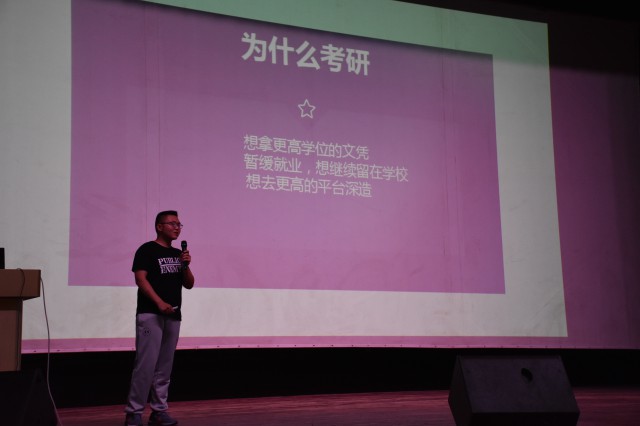 考研到中南大学的胡锦波同学从为什么要考研到如何备考两方面展开交流。他认为考研这场心理战必须要树立明确的目标,不能给自己留后路,要坚定自己的考研信念,认真对待学习,每个科目要有合理切实的学习方法和时间安排,因为考研同时也是信息的制衡。