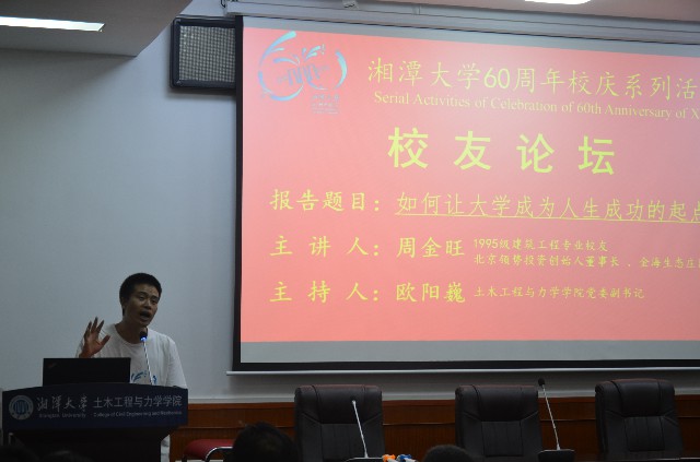 周金旺在随后的提问交流环节和同学们分享到,大学生要敢于尝试,发现自己的天赋。在大学中,大家要尽早的发宏愿,要比别人更努力。与此同时,在规划过程中,要坚持不懈,汲取黄山绝壁上松树的精神,在现实的裂缝中,追求自己的乐趣和理想。要学会与拥有伟大心灵的人交朋友,多读人物传记,吸取伟人的精神和力量。看到台下一个个朝气蓬勃的老员工,周金旺先生回忆往事,认为自己的老员工活不够完美,希望他提出的五点建议能帮助学弟学妹们少走弯路,迅速成为让母校骄傲的人才。