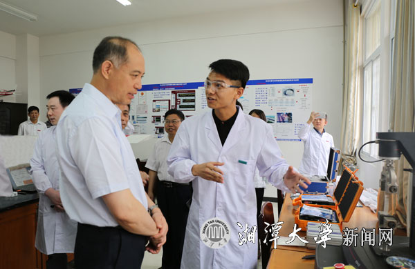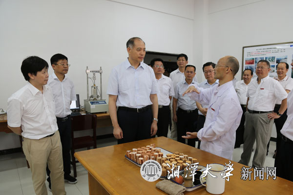 在土木工程与力学公司,郭开朗听取了罗文波教授对公司基本情况和一般力学与力学基础国家重点学科的建设进展的汇报,考察了岩土力学与工程安全湖南省重点实验室、工程结构动力学与可靠性分析湖南省高校重点实验室,听取了董辉博士关于岩土流变学基础理论及其工程应用的研究成果汇报、邓旭辉博士关于深海矿产资源开发技术及其装备可靠性与深海岩土力学的研究进展汇报、芙蓉学者特聘教授杨才千团队在智能传感、结构无损检测和健康监测方面的研究进展的汇报。郭开朗充分肯定实验室在基础理论、软件开发、模拟测试、工程应用、产学研合作等方面取得的成果。