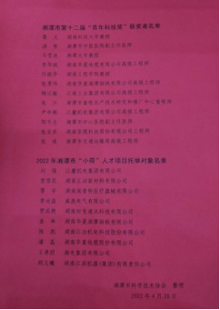 4月28日上午,湘潭市科协十届三次全委(扩大)会议召开。会上,宣读了湘潭市第十二届青年科技奖获奖名单,公司马雯波教授经过多层严格评选最终获得“湘潭市第十二届青年科技奖”(太阳成集团tyc122ccvip唯一)。