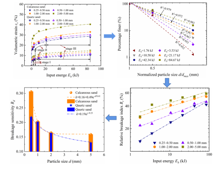 近日,公司龙志林教授课题组陈莎莎硕士在工程领域权威期刊《Construction and Building Materials》(Top期刊,Q1,影响因子6.141)上发表题为“Effects of particle size on the particle breakage of calcareous sands under impact loadings” (作者:陈莎莎, 张军辉, 龙志林*, 旷杜敏, 蔡洋)的学术论文。该论文通过一系列均匀钙质砂的冲击荷载试验,研究了冲击载荷作用下钙质砂的尺寸依赖性行为。基于不同尺寸钙质砂的孔隙比与输入能量的关系,提出了临界能量的概念来解释砂土的抗冲击性能。此外,还提出了用于评价砂土破碎敏感性的“破碎敏感性指数”Bd,其定义为每单位输入能量下相对破碎指数的增量。