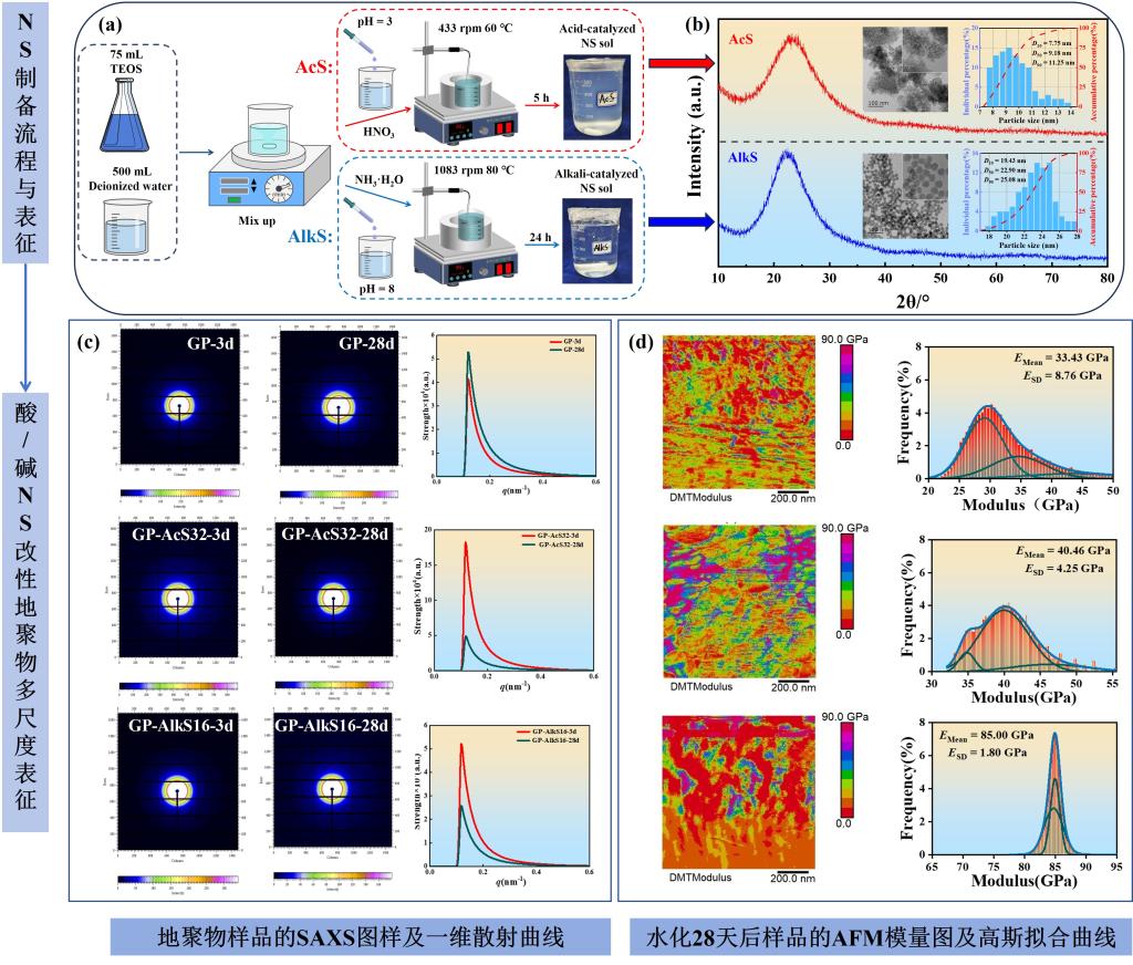 该研究首次系统比较了不同催化条件下制备的NS对地聚物性能的影响,揭示了碱性环境在提升NS分散性、优化微观结构与增强力学性能方面的关键作用,为绿色高性能地聚物材料的设计与应用提供了理论依据与技术支撑。