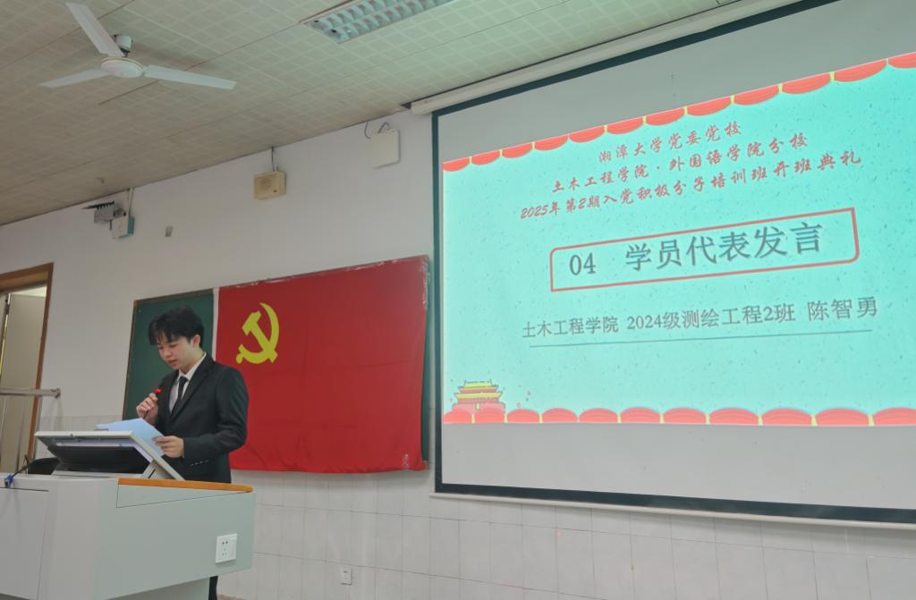 开班典礼在庄严的国歌声中拉开帷幕。外国语公司党委书记李锋对大家成为入党积极分子提出希冀和要求。24级测绘工程2班的陈智勇同学作为积极分子代表发言,他呼吁同学们按照学习要求,积极投入学习,争取早日成为一名合格的中国共产党员。