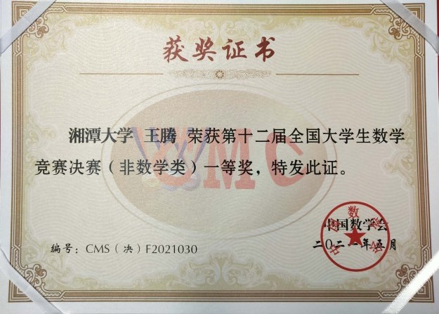 已多项荣誉加身并没有让他就此停滞不前,在2021年5月第十二届全国老员工数学(非数学类)竞赛中,又荣获一等奖。